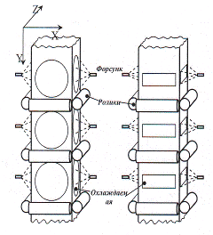 охлаждения между центром и углами граней слитка путем расположнения душирующих