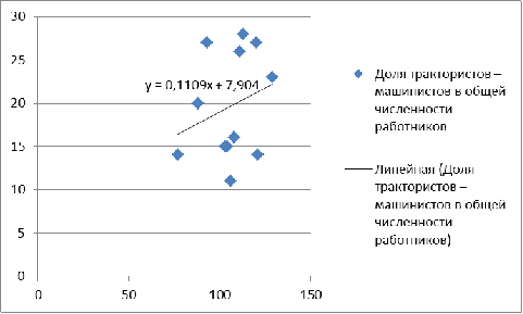 (тыс. руб.) и Долей трактористов - машинистов в общей численности работников,