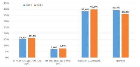 В первые III квартала 2013 года наибольший рост показывали вклады суммой от 700 тыс.