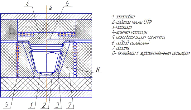 матрица; 4 - крышка матрицы; 5 - нагревательные элементы; 6 - подвод газа