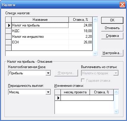 Введем в диалоговом окне Налоги, действующие на период реализации проекта