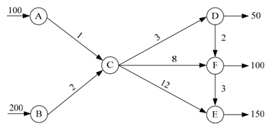 B, C, D, F), четыре пункта назначении (C, D, F, E) и три транзитных пункта (C,