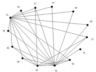 продаж, ликвидность и т.д.) как вершин, соединенных ребрами, веса которых