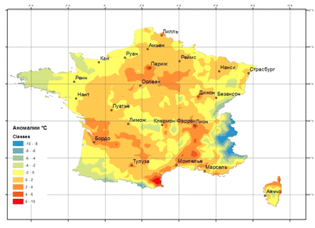 Рисунок 45. Изоаномалы температуры земной поверхности Франции,