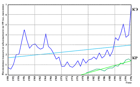 Рис.1. Динамика заболеваемости КЭ за 1950 - 1996 гг. и