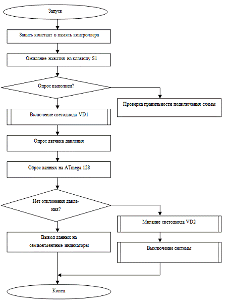 цикличном режиме. При включении клавиши S1 срабатывает запуск системы и загорается светодиод VD1. С аналогового датчика давления BMP 180 данные поступают на контроллер ATmega 128. После обработки показаний