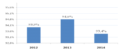 снижение показателя в 2013 году относительно 2012 года и рост в 2014;
