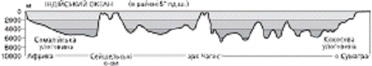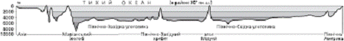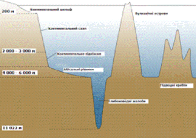 рельєфу дна океану: підводна окраїна материків, перехідна зона, ложе океану і