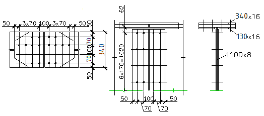 вертикальными накладками сечением 340 x 1100 x 8 мм.