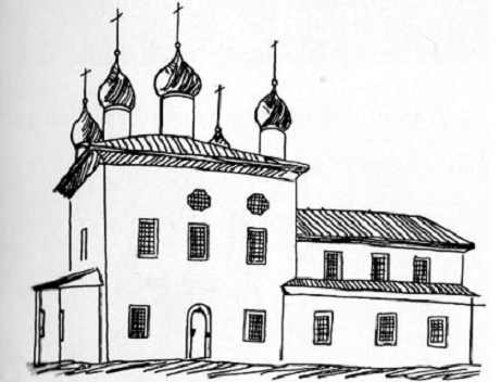 трапезной противопоставлялись вертикали колокольни и высокого четверика с