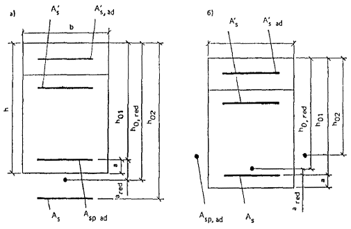 усиливаемого элемента и дополнительной напрягаемой арматуры при расположении