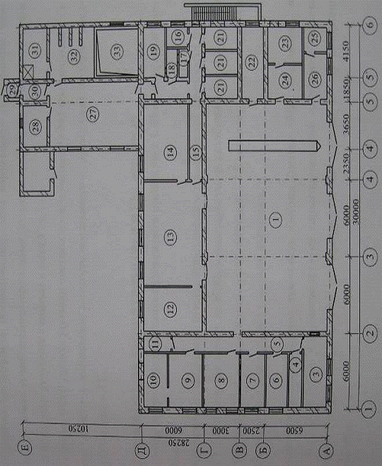 Здание состоит из основной части (в осях А-Д-1-6) и пристройки (в осях
