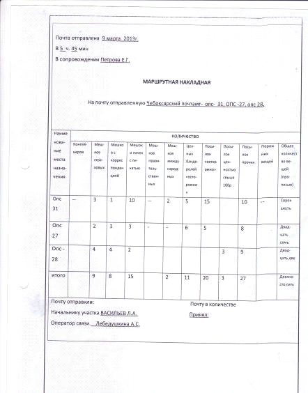 пачек с печатью к почтовым шкафам опорных пунктов и др.