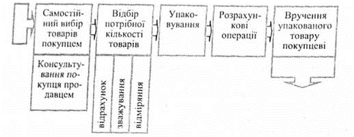 продажем з відкритою викладкою і самообслуговуванням. При цьому склад основних