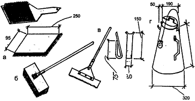 скребок для намазывания и разравнивания мастики; г - ножи; д - бачок