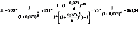 NPV=(5037,2/(1+0,075)^1)+(7898,7/(1+0,075)^2)+(7924,03/(1+0,075)^3)+(6139,82/(1+0,075)^4)-(13000/(1+0,075)^0)= 9496,80 тыс. руб.