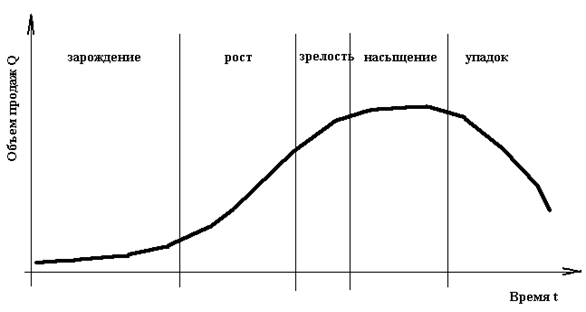 разработку, внедрение, рост, спроса, зрелость (или стабилизацию) и спад.
