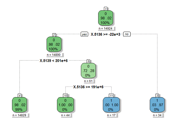 ) X.5139< 1.951823e+08 986 52 0 (0.947261663 0.052738337)