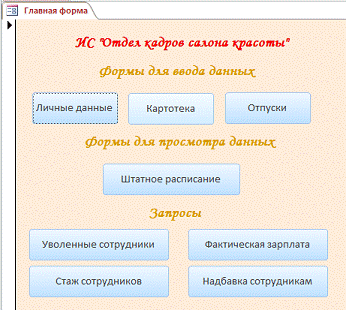 форм (формы «Личные данные», «Карточки сотрудников», «Отпуски»);