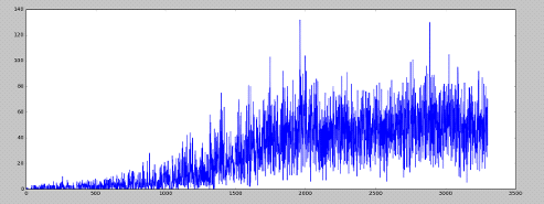 После ~ 2000 игровых эпизодов, обучение сильно замедлилось и