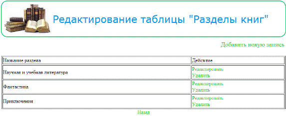 Формы редактирования для таблиц «Книги», «Разделы» и «Читатели» приведены