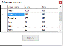 }void таблицаРезультатовToolStripMenuItem_Click(object sender, EventArgs e) //открытие таблицы результатов