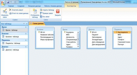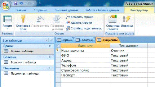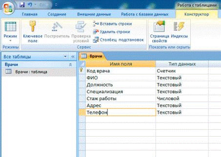 Вид таблицы Врачи в режиме конструктора показан в Приложении A на рисунке 1.