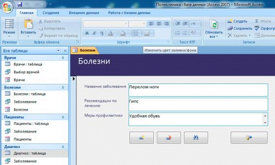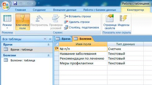 присвоив ей название Болезни. Создадим следующие поля для данной таблицы: