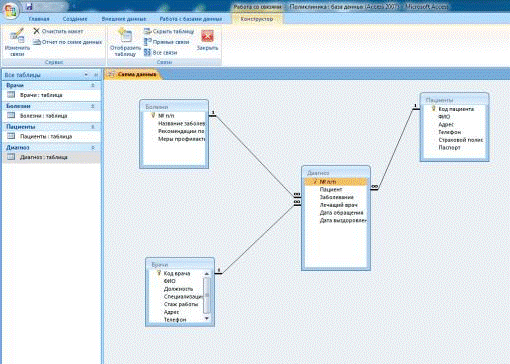 таблицы, перейти на вкладку Работа с базами данных и выбрать пункт Схема