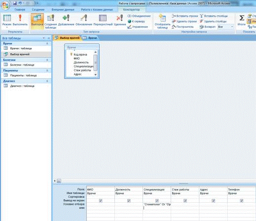 Рисунок Б.2. Запрос выбор врачей в режиме конструктора.