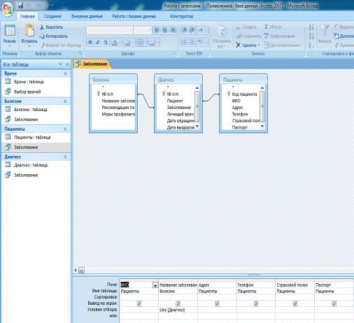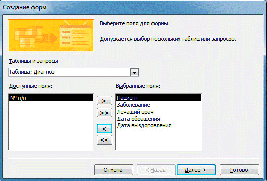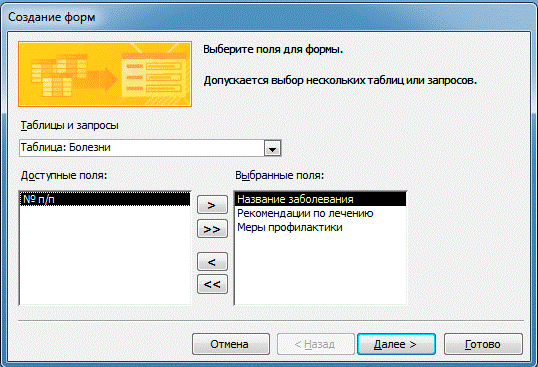 ФИО; для поля заболевание выбираем № п/п и Название заболевания; для поля