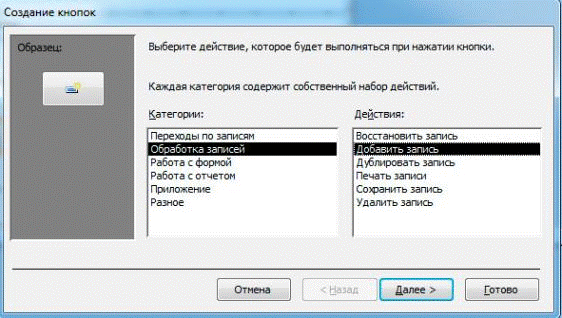 Рисунок В.4. Выбор действия для кнопки создания новой записи