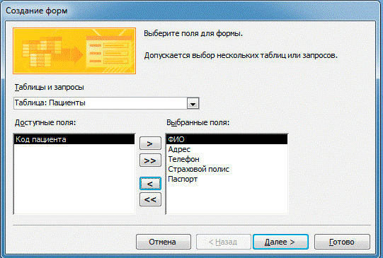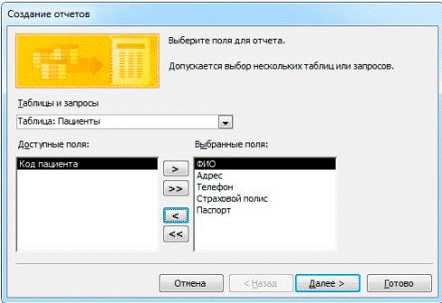 Следующим шагом является выбор полей: для поля пациент выбираем Код пациента и