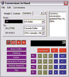 перевода, Conversions In Hand содержит справочные данные о телефонных кодах и