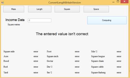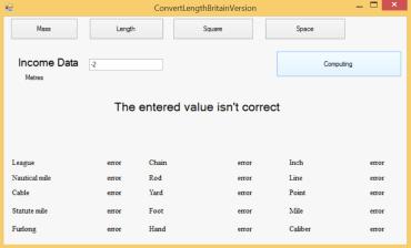 При нажатии любой из четырех кнопок (Mass/Length/Square/Space) приветственное