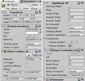 в) Взаимодействие с объектом Death. Если персонаж упадет за платформу, то он соприкасается с объектом