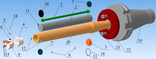 собранный корпус 2, резиновую прокладку 16 и переходник 4, и фиксируют его