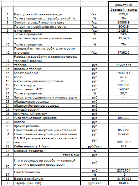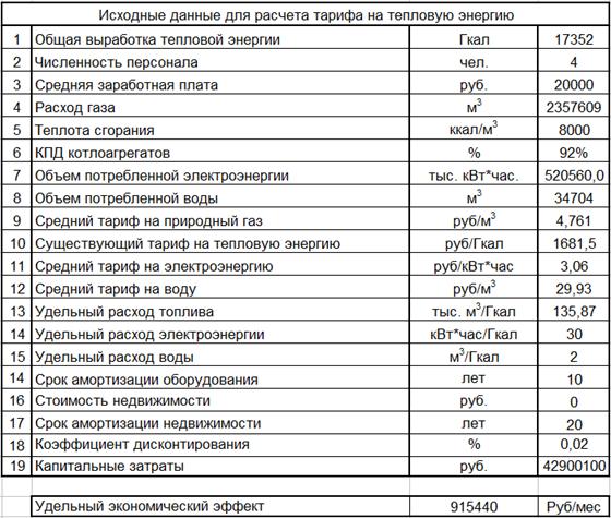 Исходные данные для расчета тарифа на тепловую энергию
