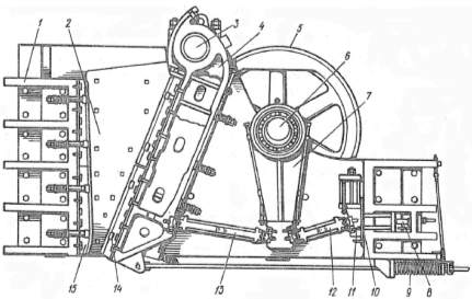 неподвижной, причем при сближении щек (ход сжатия) куски материала дробятся,