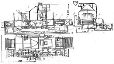 фундамент; 15 - отвод в канализацию; 16 - нижний рельс конвейера; 17 -