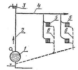 котел; 2 - главный паровой стояк; 3 - паровая магистраль; 4 - паровые стояки; 5