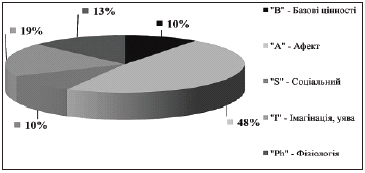 - базові цінності, виявився у 8 (10%) осіб, канал «А» - афект, спостерігався аж
