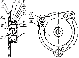 под определёнными углами располагаются 3 отверстия под шпильки диаметром 9 мм,