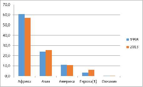 более по континентам происхождения в 1998 и 2013 году