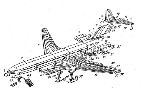 деталі, які входять в планер, потім агрегати поділяють на відсіки, вузли та