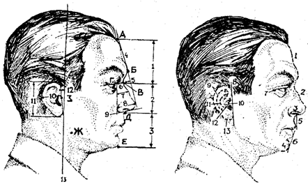 ротовой щели, 12 - высота подбородка, 13 - оттопыренность ушной раковины, 14 -