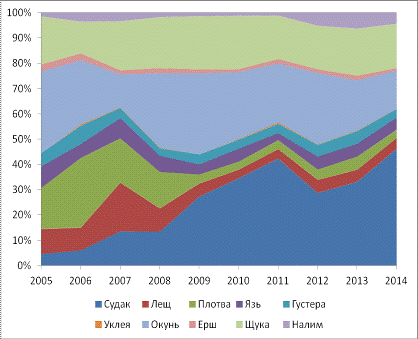 лова являются судак, лещ и щука, доля которых суммарно достигает 80-90% от