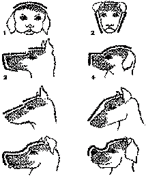 - лоб, 2 - переносица, 3 - морда, 4 - мочка