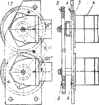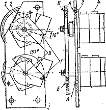 общей боковине 3. Валики 1, вращающие кулачковые шайбы, при помощи шестерен 2 и