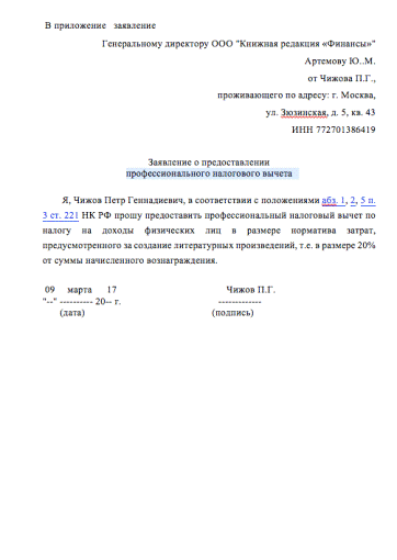 предоставления профессиональных вычетов в ООО «Книжная реакция «Финансы»
